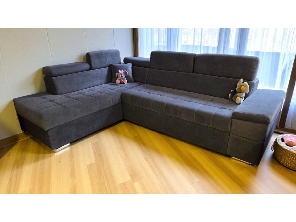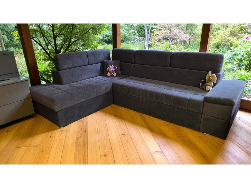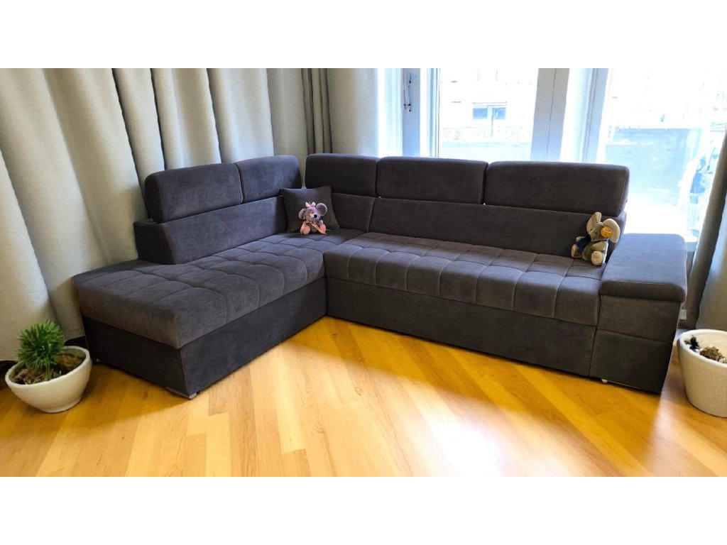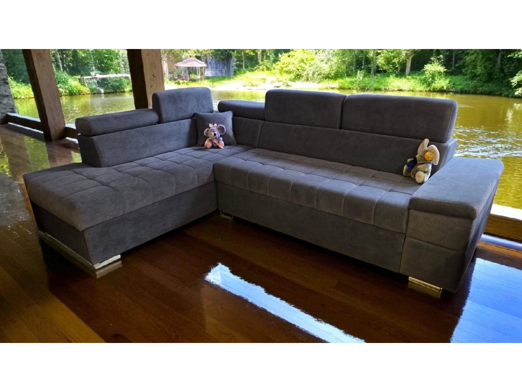 Rohová sedací souprava s polohovacími podhlavníky. Specifická sedací souprava tužšího posedu pro zákazníky trpícími bolestí kloubů, kyčlí a zad. Tužší sezení rovněž zajistí pohodlné vstávání ze sedací soupravy a také dlouhodobou životnost, bez nežádoucího efektu prosezení. Velmi prostorná v jedinečném designu uspokojí potřeby i toho nejnáročnějšího zákazníka. Praktické polohovací podhlavníky zajistí pohodlí při opření hlavy. Vnitřní výplní je zdravotní jádro tvořeno dvojitým zdravotním pružením dle německé technologie v kombinaci s paměťovou studnou pěnou HR50, která zajistí luxusní odpočinek a v neposlední řadě také dlouhodobou životnost bez nežádoucího efektu prosezení. Sedací souprava je rozkládací, s úložným prostorem. Možno zvolit typ potahu, typ područky, otočení rohu, popř. úpravu rozměru.