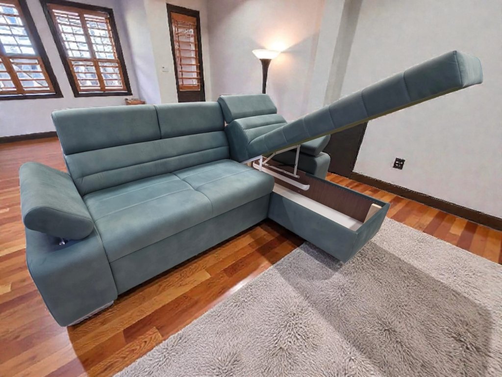 Rohová sedací souprava s polohovacími podhlavníky. Specifická sedací souprava tužšího posedu pro zákazníky trpícími bolestí klobů, kyčlí a zad. Tužší posezení rovněž zajistí pohodlné vstávání ze sedací soupravy a také dlouhodobou životnost bez nežádoucího efektu prosezení. Velmi prostorná, v jedinečném designu uspokojí potřeby i toho nejnáročnějšího zákazníka. Praktické polohovací podhlavníky zajistí pohodlí při opření hlavy. Vnitřní výplní je zdravotní jádro tvořeno dvojitým zdravotním pružením dle německé technologie v kombinaci s paměťovou studnou pěnou HR50, která zajistí luxusní odpočinek a v neposlední řadě také dlouhodobou životnost bez nežádoucího efektu prosezení. Sedací souprava je rozkládací, s úložným prostorem. Možno zvolit typ potahu, typ područky, otočení rohu, popř. úpravu rozměru.