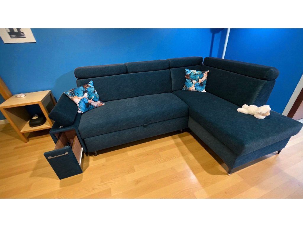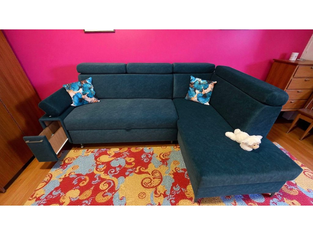 Rohová sedací souprava s polohovacími podhlavníky. Specifická sedací souprava tužšího sezení pro zákazníky trpícími bolestí kloubů, kyčlí a zad. Tuhý posed rovněž zajistí pohodlné vstávání ze sedací soupravy a také dlouhodobou životnost bez nežádoucího efektu prosezení. Velmi prostorná v jedinečném designu uspokojí potřeby i toho nejnáročnějšího zákazníka. Praktické polohovací podhlavníky zajistí pohodlí při opření hlavy. Vnitřní výplní je zdravotní jádro tvořeno dvojitým zdravotním pružením dle německé technologie v kombinaci s paměťovou studnou pěnou HR50, která zajistí luxusní odpočinek a v neposlední řadě také dlouhodobou životnost bez nežádoucího efektu prosezení. Sedací souprava je rozkládací, s úložným prostorem. Možno zvolit typ potahu, typ područky, otočení rohu, popř. úpravu rozměru. Sedací souprava je doplněna výsuvným odkládacím šuplíkem a zabudovanou zásuvkou s USB v opěrné části.